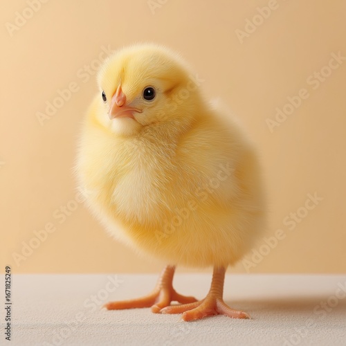 © Photo tiime, Fototapeta premium Adorable fluffy yellow baby chick standing on a pastel background, looking curious and innocent.