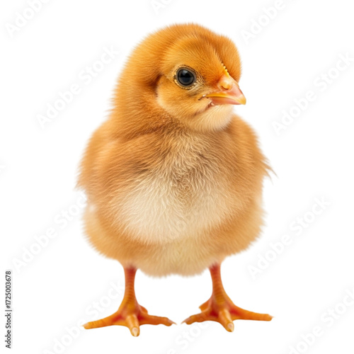 © Happy, Fototapeta premium Adorable fluffy yellow chick standing against a white background