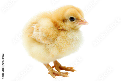 © Jenjira, Fototapeta premium Adorable fluffy yellow chick standing against white background, perfect for Easter, farm, or animal-themed designs and projects.