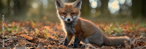 © Ilja, Fototapeta premium Adorable fox cub nestled in a sunlit forest, surrounded by glowing leaves and enchanting trees.