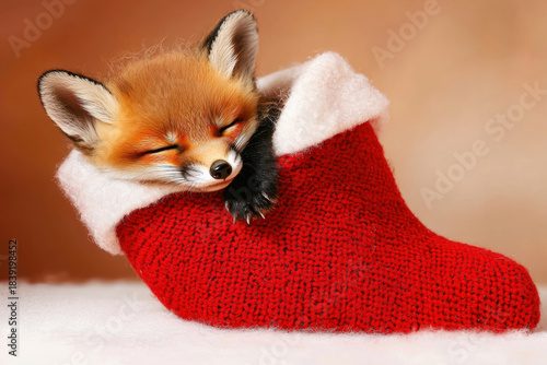Fototapeta premium Adorable fox cub sleeping peacefully in red christmas stocking with white...