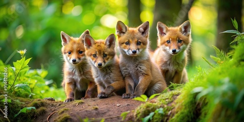 Obraz premium Adorable fox cubs playing in the lush forest , wildlife, nature, cute, young,...