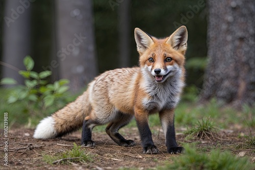 Fototapeta premium Adorable Fox Kit Engaging in Playful Activities in North American Forest