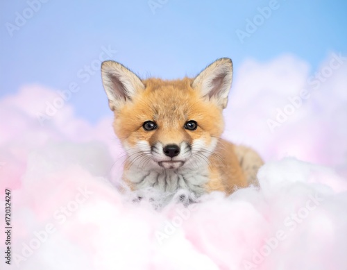 © Zen, Obraz premium Adorable fox kit resting in a cloud of pink cotton candy