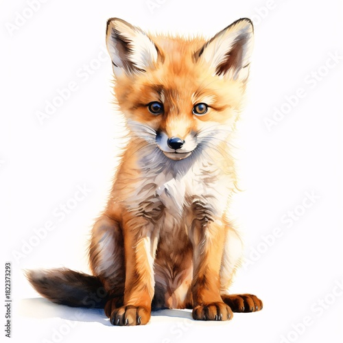 Obraz premium Adorable fox kit sits patiently against a white background looking directly at viewer