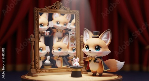 © Ariestia, Obraz premium Adorable fox magician presents a rabbit emerging from a hat beside an ornate mirror
