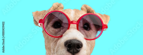 © Viorel Sima, Obraz premium Adorable fox terrier dog wearing red sunglasses