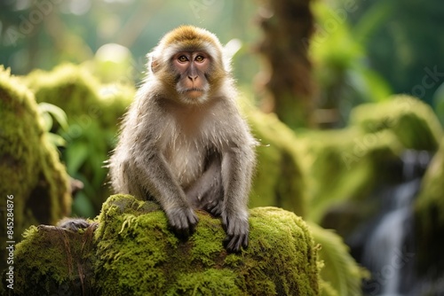 © Ziesta, Fototapeta premium Adorable furry barbary macaque monkey sitting on a stone in the jungle in bali