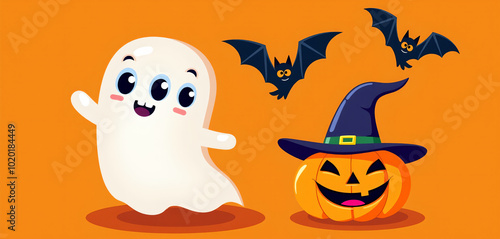 Fototapeta premium Adorable Ghost Pumpkin Witch Hat Halloween Bats