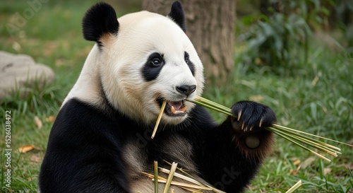 Fototapeta premium Adorable Giant Panda Bear Eating Bamboo Shoots in a Natural Habitat
