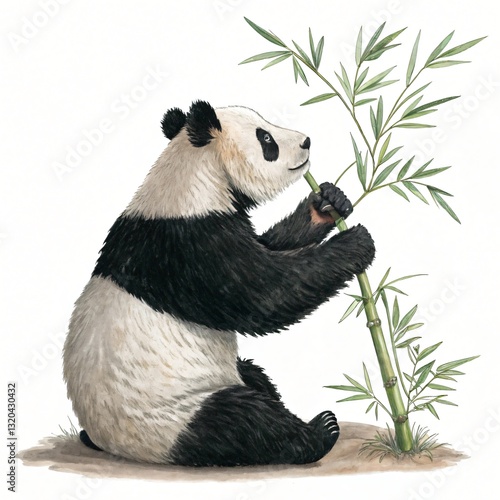 © WisChi, Naklejka premium Adorable Giant Panda Bear Eating Fresh Bamboo Shoots in Watercolor Illustration