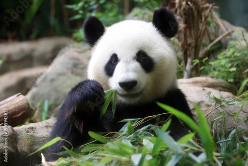 Fototapeta premium Adorable Giant Panda Munching on Bamboo Leaves in Natural Habitat