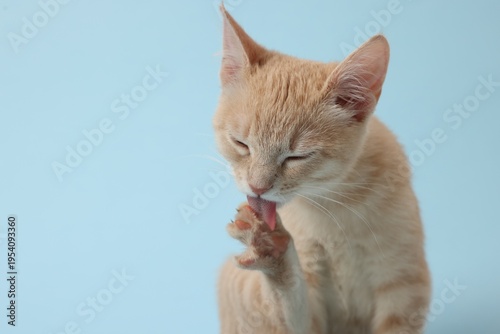 Fototapeta premium Adorable ginger cat on light blue background, space for text