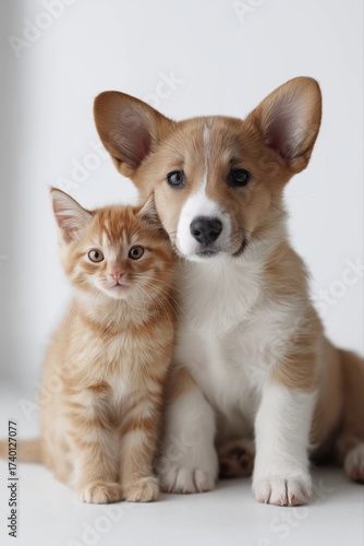 Obraz premium Adorable ginger kitten and corgi puppy posing together on white background