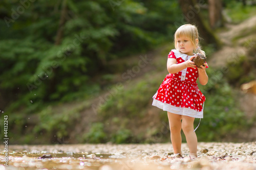 © Joshhh, Naklejka premium Adorable girl throw stone to river stream in park