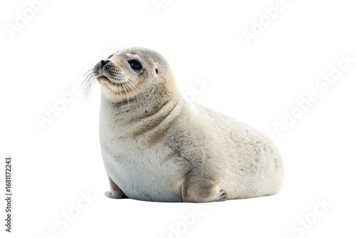 © Tanicsean, Fototapeta premium Adorable gray and white seal pup sitting upright with large dark eyes and whiskers, isolated on a transparent background