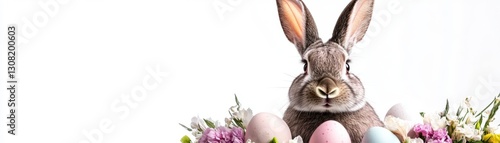 Obraz premium Adorable gray bunny surrounded by pastel Easter eggs and spring flowers against a bright white background. Perfect for Easter cards or spring