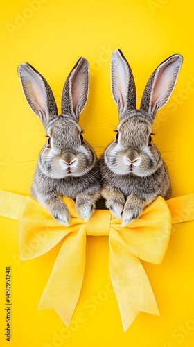 Obraz premium Adorable Gray Rabbits with Yellow Bow Easter Gift