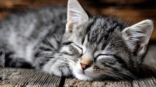 © TimelessClicks, Naklejka premium Adorable Gray Tabby Kitten Sleeping Peacefully on Rustic Wood Surface