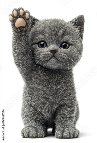 Obraz premium Adorable Grey Kitten with Raised Paw, Cute Expression, Fluffy Fur, Playful Attitude, High-Quality Portrait for Animal Lovers, Pet Enthusiasts, and More