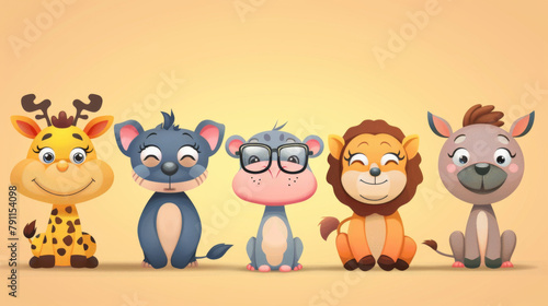 Naklejka premium Adorable group of cartoon safari animals, including a giraffe, elephant, lion, and deer, illustrated against a warm background.