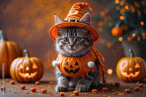 Naklejka premium Adorable Halloween Kitten Dressed in Costume on Cozy Amber Background