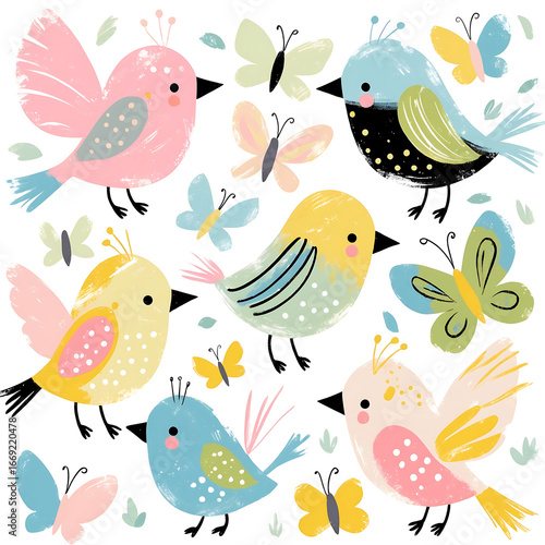 Fototapeta premium Adorable hand-painted birds and butterflies in a playful pastel color palette