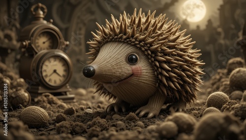 © Ai DreamscapesTH, Obraz premium Adorable Hedgehog in Sepia Tone Setting near Vintage Clock