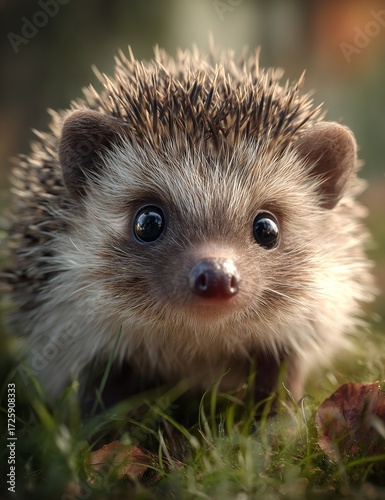 Fototapeta premium Adorable hedgehog peeking from lush green grass with sparkling eyes,...