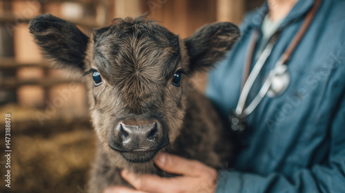 Fototapeta premium Adorable Highland Calf Gently Held by Veterinarian, Close-Up Portrait in Barn...