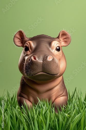 Naklejka premium Adorable Hippo Sitting in Lush Green Grass