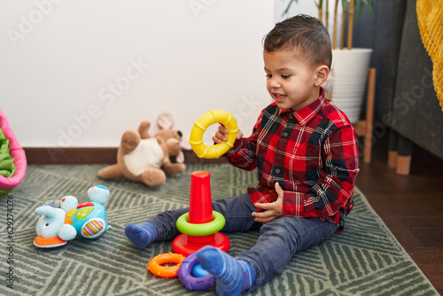Obraz premium Adorable hispanic boy playing with hoops game sitting on floor at home