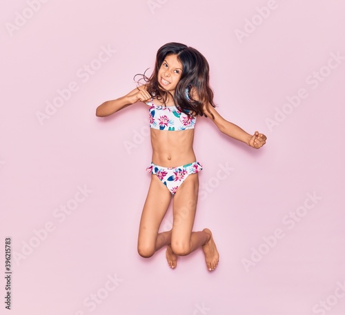 Naklejka premium Adorable hispanic child girl on vacation wearing bikini surprised with open mouth. Jumping over isolated pink background