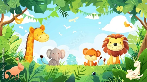 © dDenVil, Naklejka premium Adorable Jungle Animals in a Cartoon Vector Illustration Set in a Lush Forest Scene