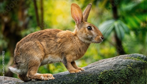 Obraz premium Adorable Jungle Rabbit Perched on a Rock amidst Wild Forest Greenery at...