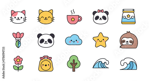 Fototapeta premium Adorable kawaii style icons featuring playful animals, nature elements and everyday objects