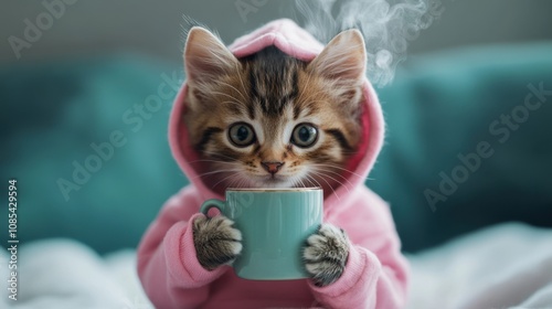 © 69, Naklejka premium Adorable kitten in a pink hoodie, holding a steaming mug with tiny paws, sitting against a warm and cozy backdrop