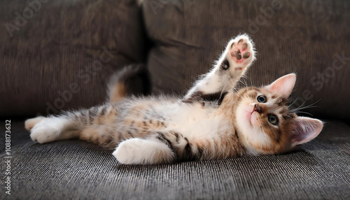 © Portraits, Fototapeta premium Adorable Kitten Lounging Upside Down on a Sofa