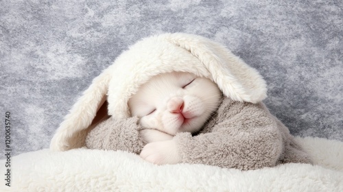 © Big9869, Fototapeta premium Adorable Kitten Sleeping in Bunny Outfit on Soft Blanket