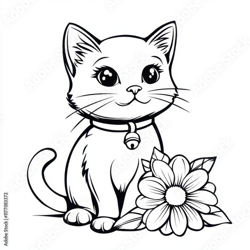 Obraz premium Adorable Kitten with Flower Cute Cat Coloring Page Illustration