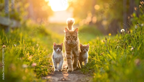Fototapeta premium Adorable kittens and mother cat in a sunlit path