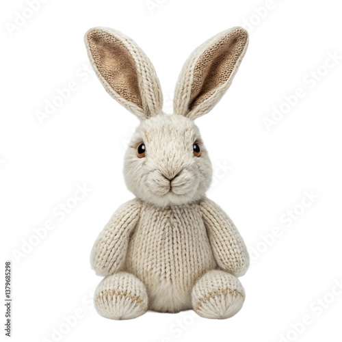 © Rizia, Obraz premium Adorable Knitted Beige Bunny Rabbit Toy Soft Plush Easter Decoration transparent background Generative AI