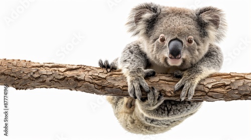 © Level UP, Naklejka premium Adorable Koala Bear Hanging on Tree Branch in Brightly Lit Studio on White Background