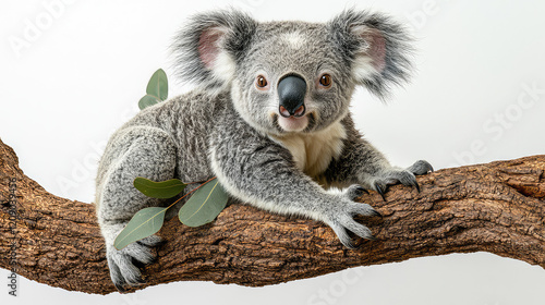 © Herdi, Naklejka premium Adorable koala bear sitting on a tree branch with eucalyptus leaves, isolated on white background.