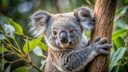© Lexi, Fototapeta premium Adorable koala climbing a tree surrounded by lush green leaves in a natural habitat