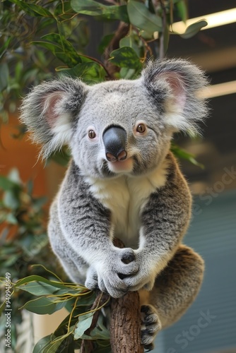 Naklejka premium Adorable koala clinging to a tree branch, surrounded by eucalyptus leaves,...
