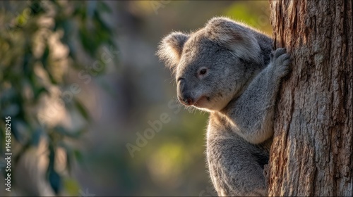 © Pornnapha, Naklejka premium Adorable koala clinging to a tree trunk in a serene natural setting captured during the golden hour of sunlight