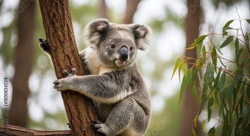 © Ahmad, Fototapeta premium Adorable Koala Clinging to Eucalyptus Tree Branch in Australian Forest.