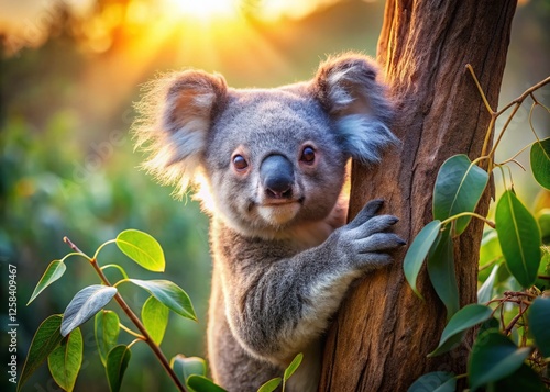 © prapatsorn, Fototapeta premium Adorable Koala Hugging Eucalyptus Tree Branch, Australian Wildlife in Natural Habitat