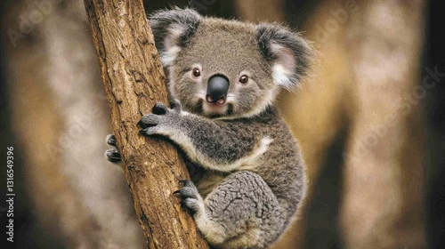 Naklejka premium Adorable koala joey clinging to a tree trunk in its natural habitat.